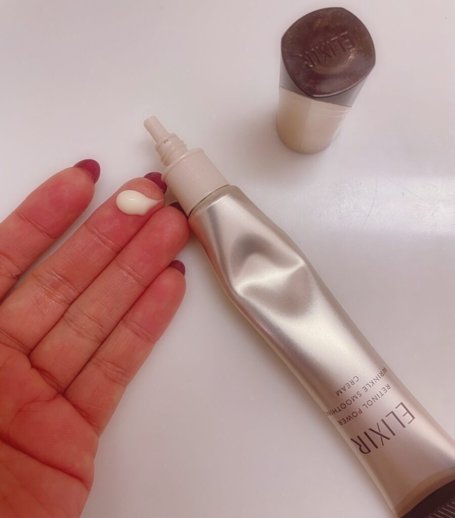 レチノパワーリンクルクリームは柔らかめのテクスチャー。よく伸びるのでおでこや首全体に塗っています。