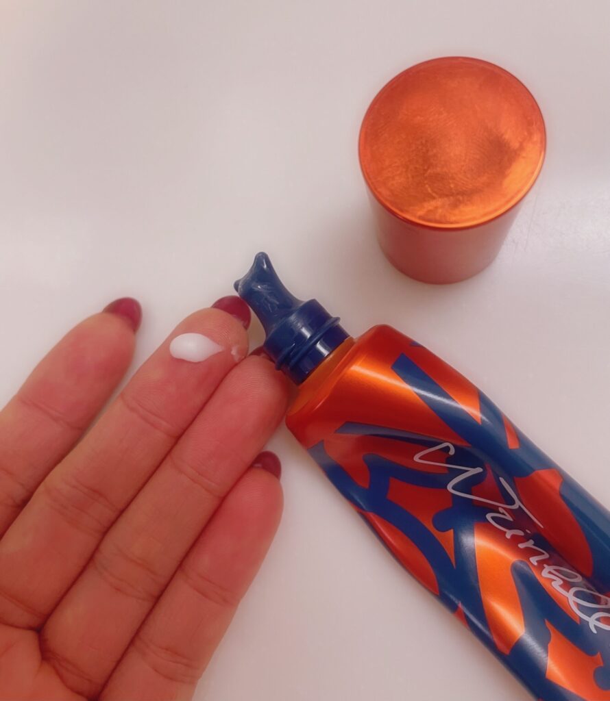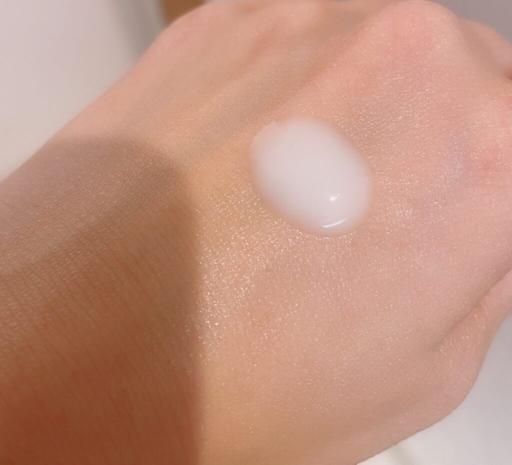 ザマイトルが1番サラッとしたテクスチャーです。顔全体に広めに塗るほか、手の甲にも塗っています。