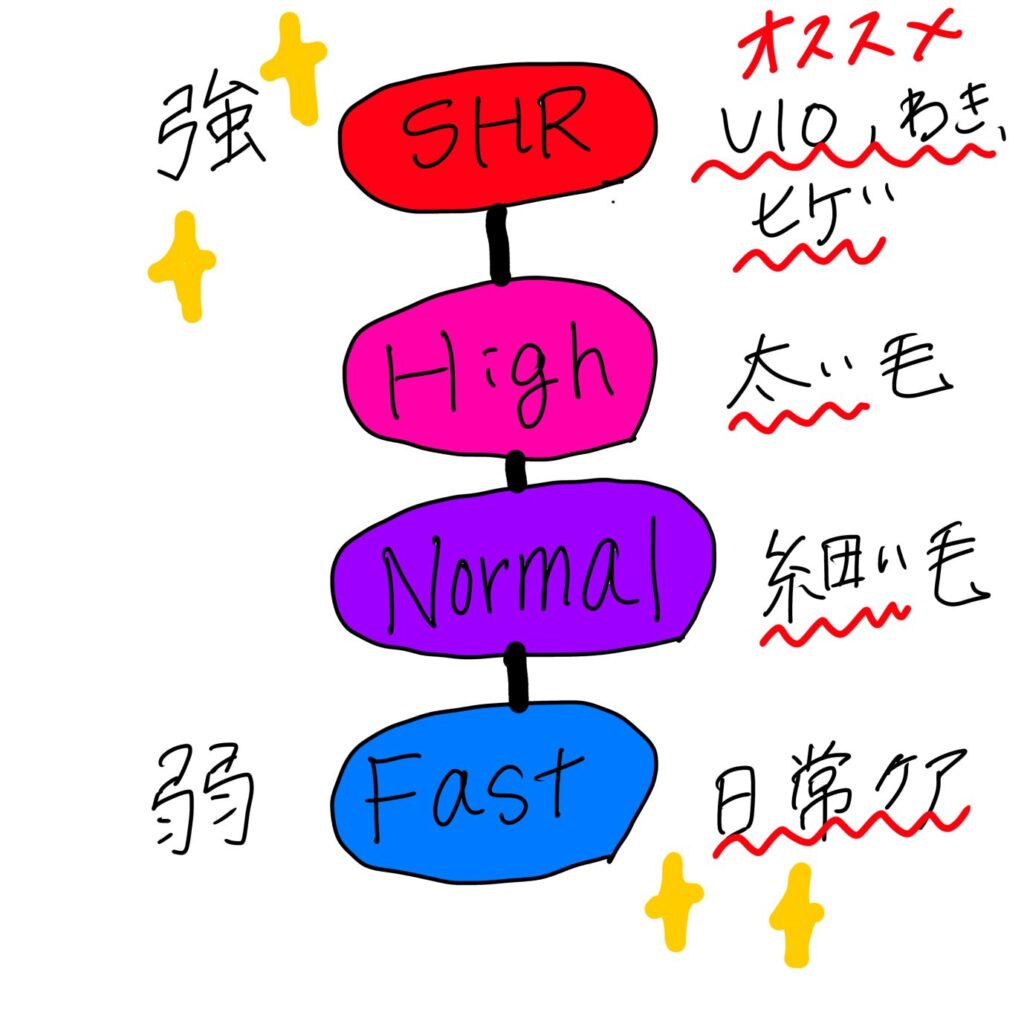 4つのモードがあります。VIOはSHRで、手足はFastモードでやっていました。
